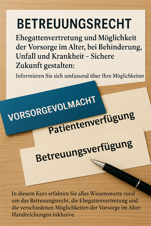 In diesem Kurs erfahren Sie alles Wissenswerte rund um das Betreuungsrecht, die Ehegattenvertretung und die verschiedenen Möglichkeiten der Vorsorge im Alter, Fakten und Unterschiede zur Vorsorgevollmacht, Patienten- und Betreuungsverfügung.